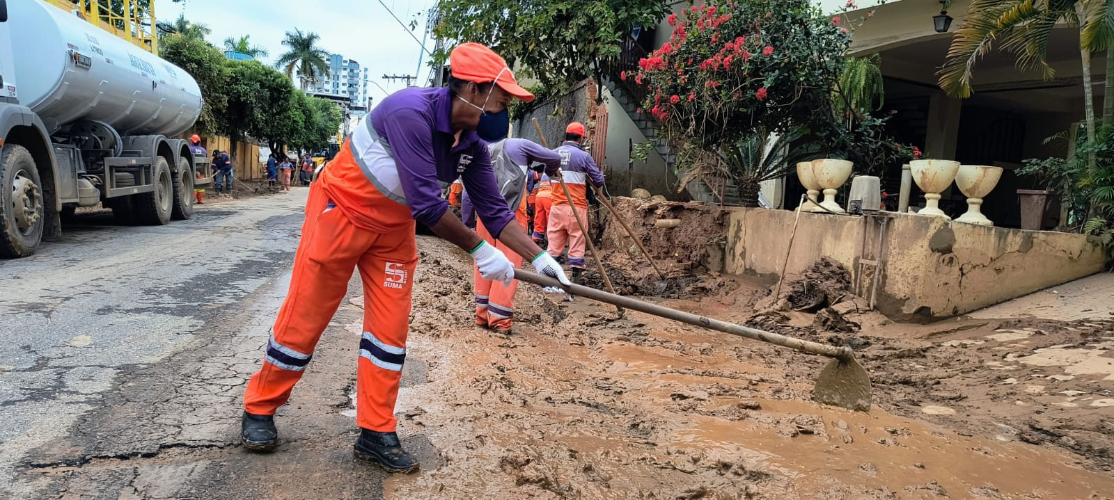 Bairros Ponte Preta, Meu Sonho e Mangueira Rural: Equipes da SUMA realizaram retirada de entulhos, móveis e limpeza geral, com apoio de retroescavadeira e caminhões. Atuação intensa nas ruas Jofre Costa Marques, Inês Guiducci, Ana Sol e Olinda Comini Sperandio, todas próximas ao Rio Ubá.