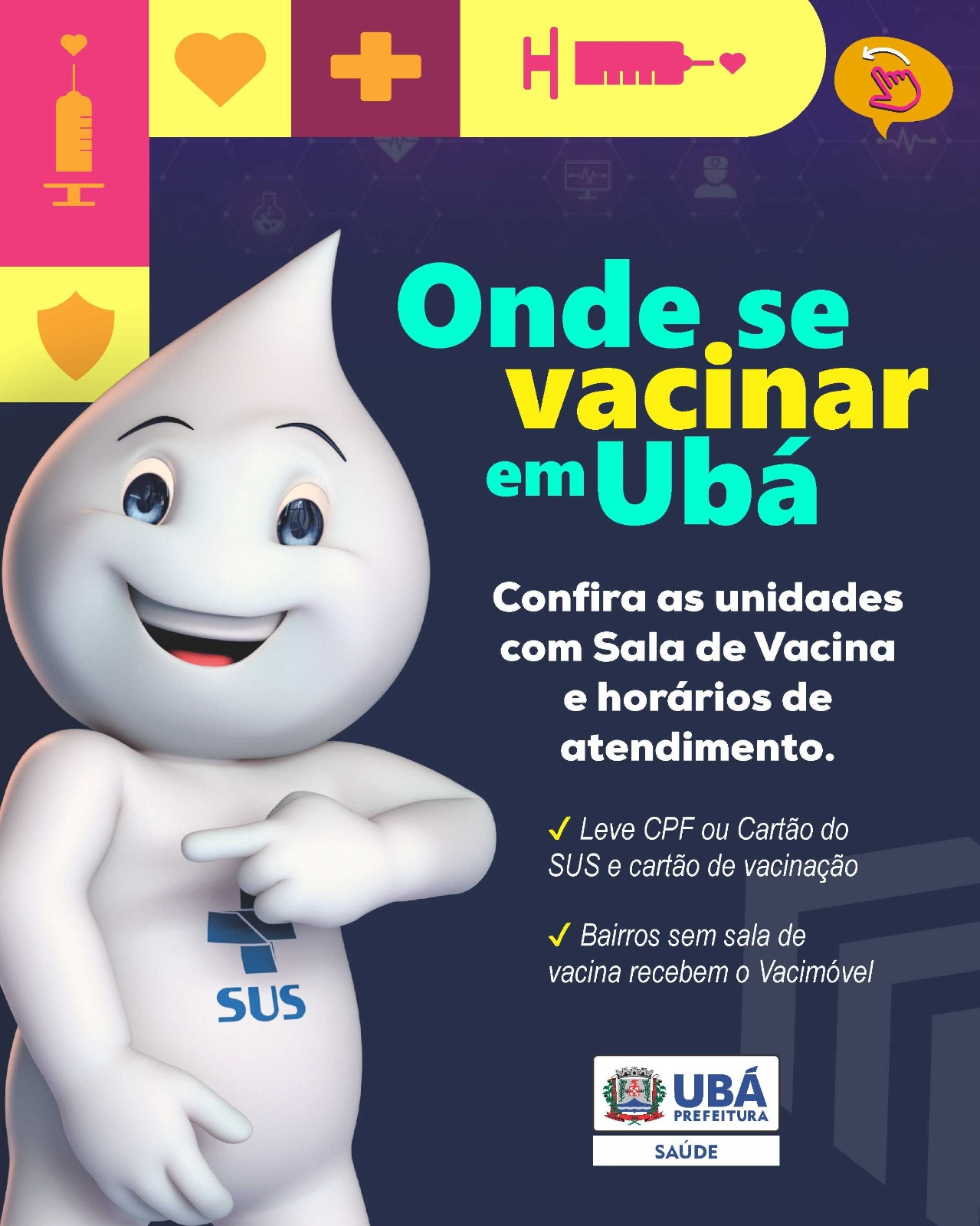 A Secretaria Municipal de Saúde de Ubá informa à população a relação das Unidades de Atenção Primária à Saúde que possuem sala de vacina, com os respectivos endereços e horários de funcionamento.