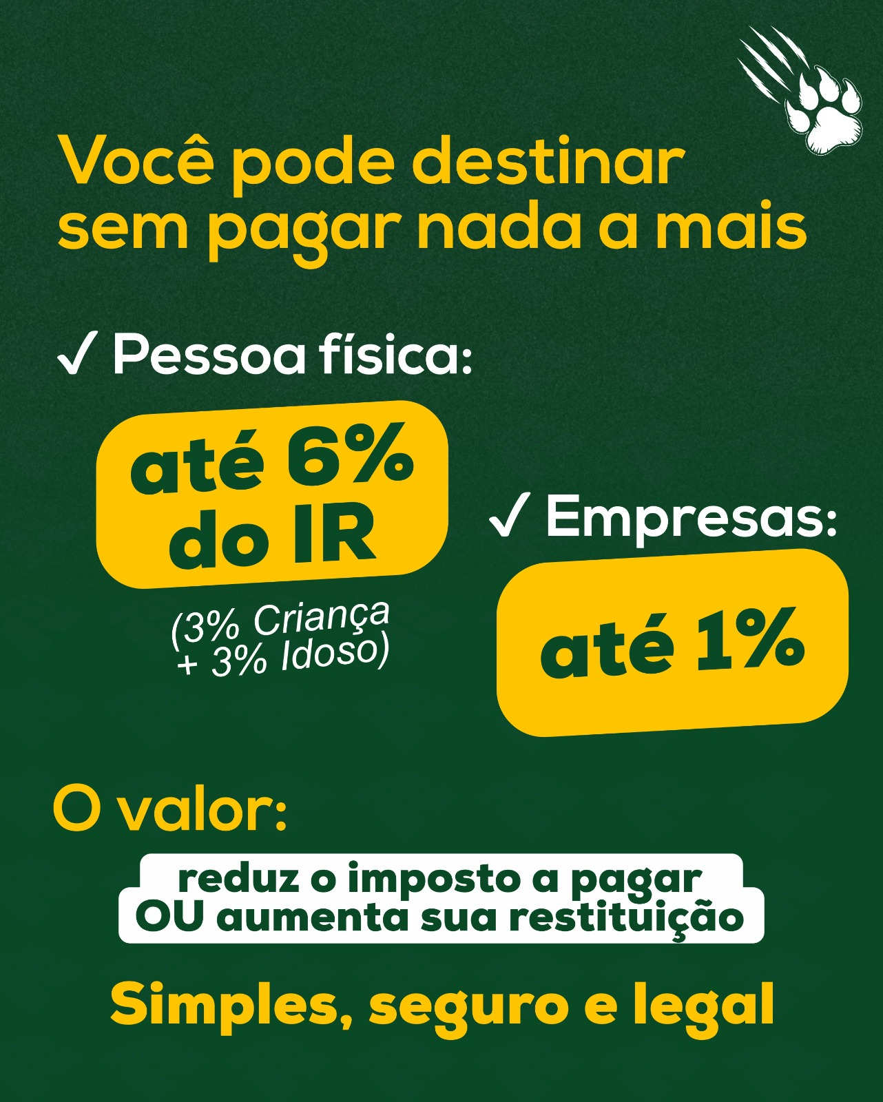 Pessoas físicas que optam pelo modelo completo da declaração podem destinar até 6% do imposto devido , sendo 3% para cada fundo. Já empresas tributadas pelo lucro real podem contribuir com até 1% . O valor doado não representa gasto extra: ele é abatido do imposto a pagar ou incorporado à restituição.
