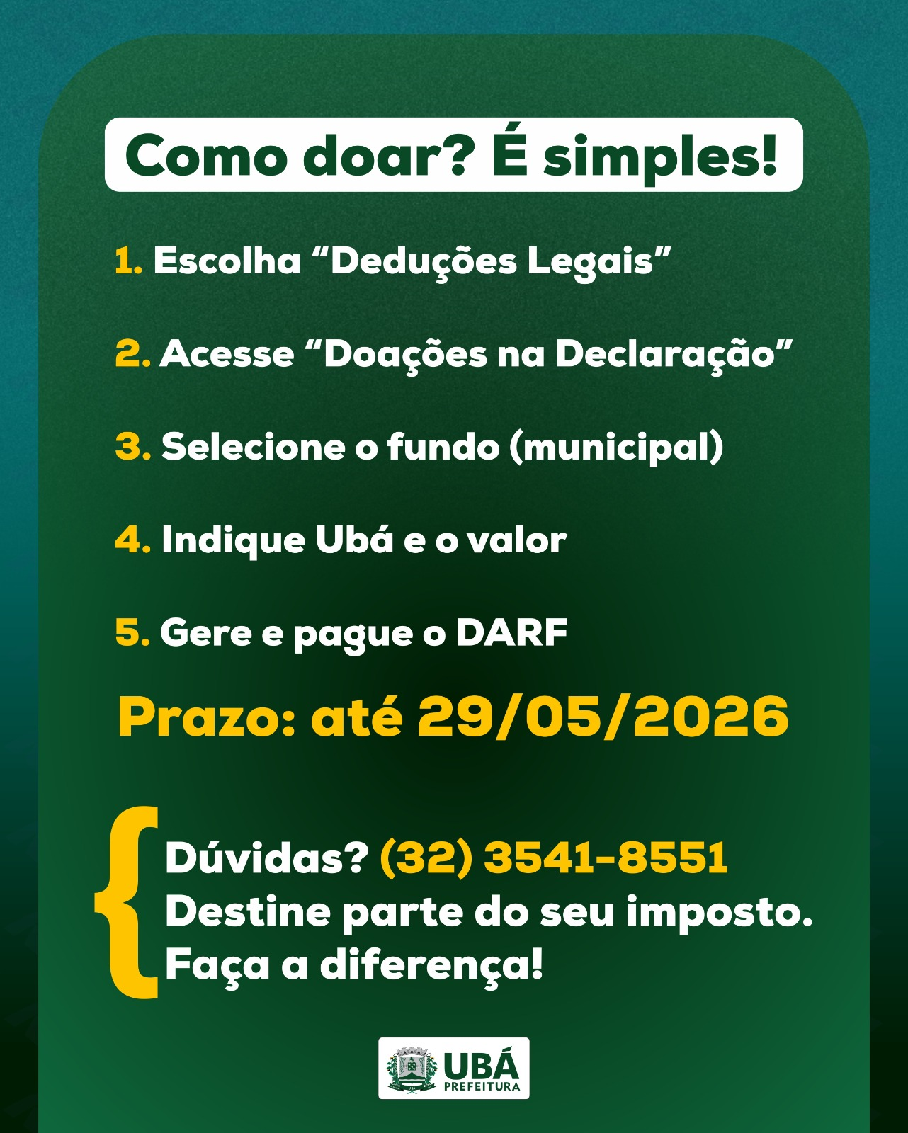 Ao optar pela destinação, o contribuinte não apenas cumpre sua obrigação fiscal, mas também investe diretamente no desenvolvimento social de Ubá, contribuindo para a promoção de direitos e para a construção de uma sociedade mais justa, solidária e inclusiva.