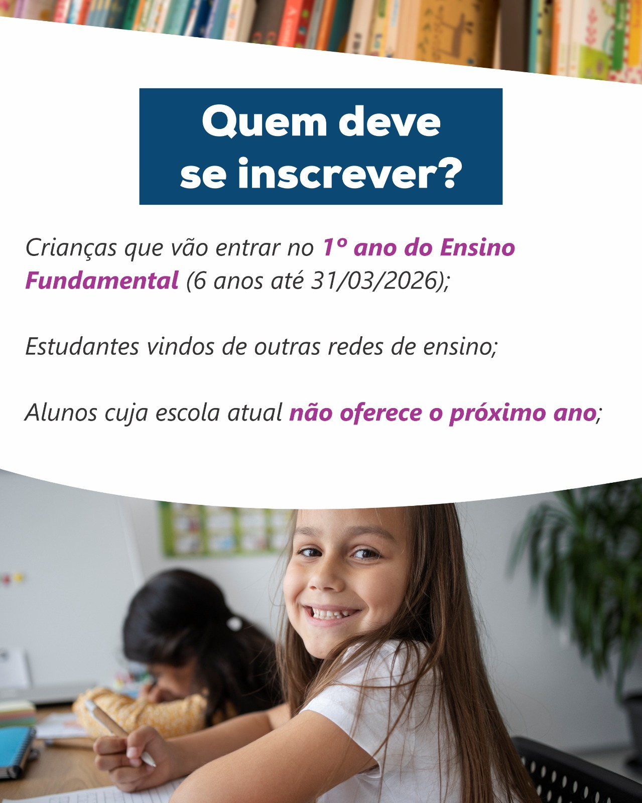 - Crianças que vão ingressar no 1º ano do Ensino Fundamental, com 6 anos completos ou a completar até 31 de março de 2026;