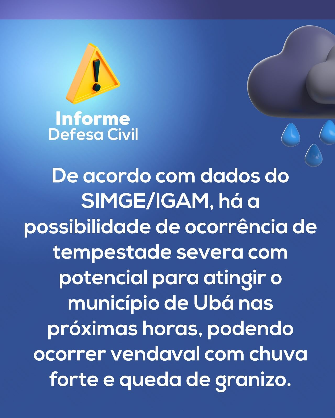 De acordo com dados do SIMGE/IGAM, há a possibilidade de ocorrência de tempestade severa com potencial para atingir o município de Ubá nas próximas horas, podendo ocorrer vendaval com chuva forte e queda de granizo.