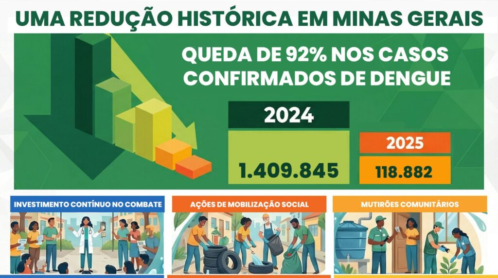 Em 2025, Minas encerrou o ano com queda expressiva nos casos de arboviroses. Foram 118.858 casos confirmados de dengue, redução de 92% em relação a 2024. No mesmo período, o estado contabilizou 17.803 confirmações de chikungunya e 26 de zika, resultado do fortalecimento da vigilância, assistência e prevenção.