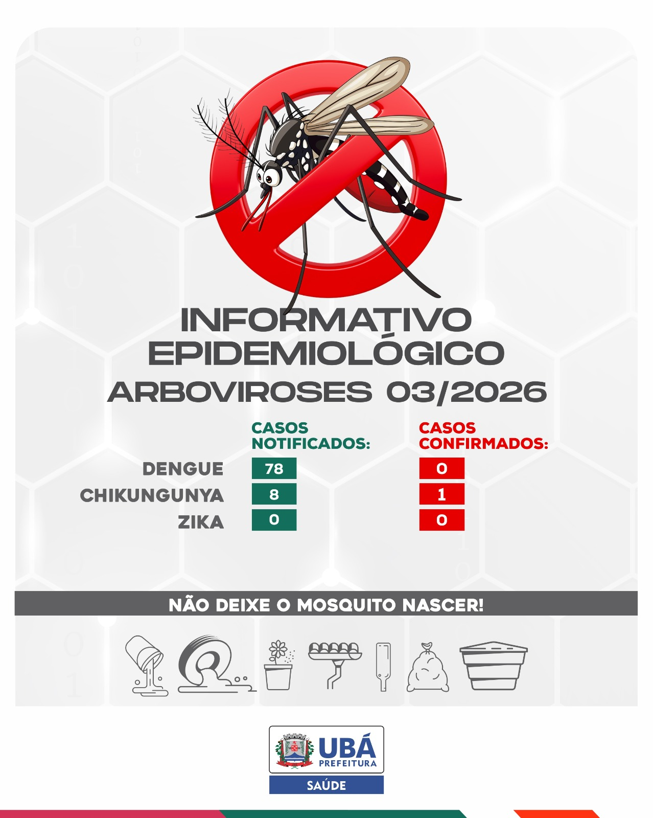 A Prefeitura de Ubá, por meio da Secretaria Municipal de Saúde, divulga o 1º Informativo Epidemiológico de Arboviroses de 2026, com dados atualizados sobre as doenças transmitidas pelo Aedes aegypti.