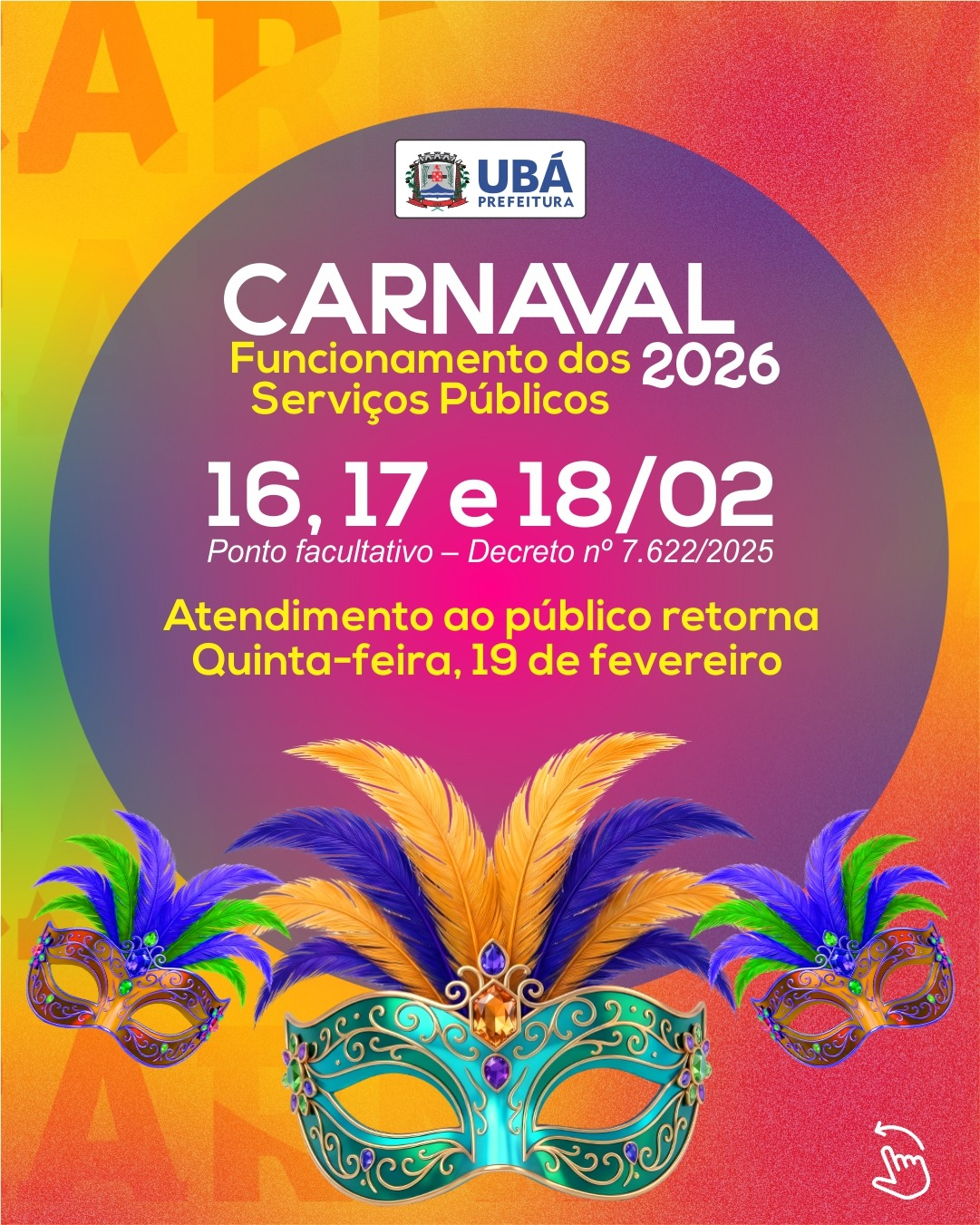 A Prefeitura de Ubá informa à população sobre o funcionamento dos serviços públicos municipais durante o período do Carnaval, conforme o Decreto nº 7.622/2025 , que estabelece os feriados nacionais, municipais e pontos facultativos para o ano de 2026.
