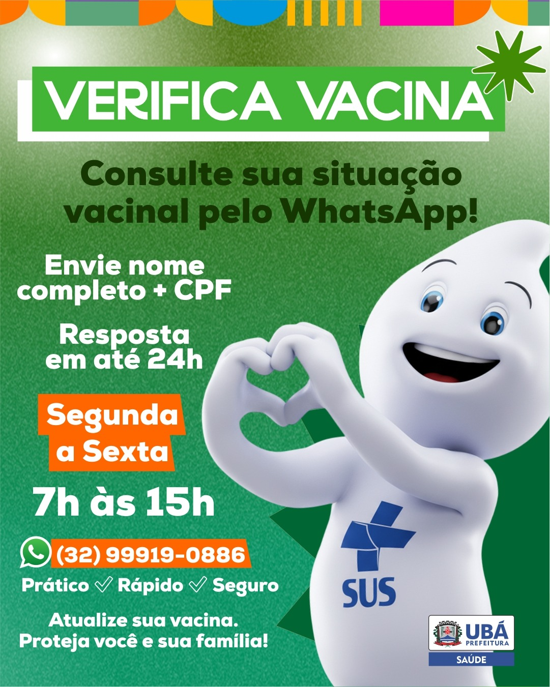 A Secretaria Municipal de Saúde disponibiliza o Verifica Vacina, um canal exclusivo para consulta da sua situação vacinal pelo WhatsApp.
