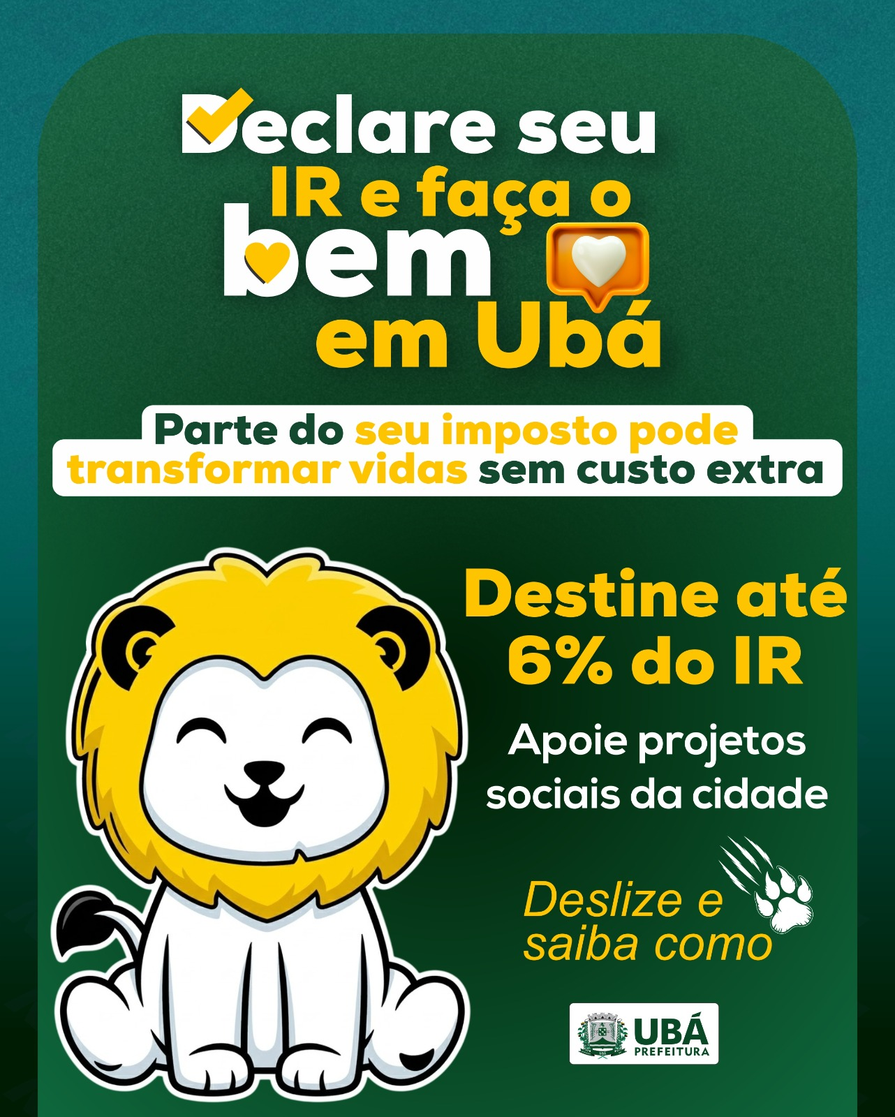 Ao optar pela destinação, o contribuinte não apenas cumpre sua obrigação fiscal, mas também investe diretamente no desenvolvimento social de Ubá, contribuindo para a promoção de direitos e para a construção de uma sociedade mais justa, solidária e inclusiva.