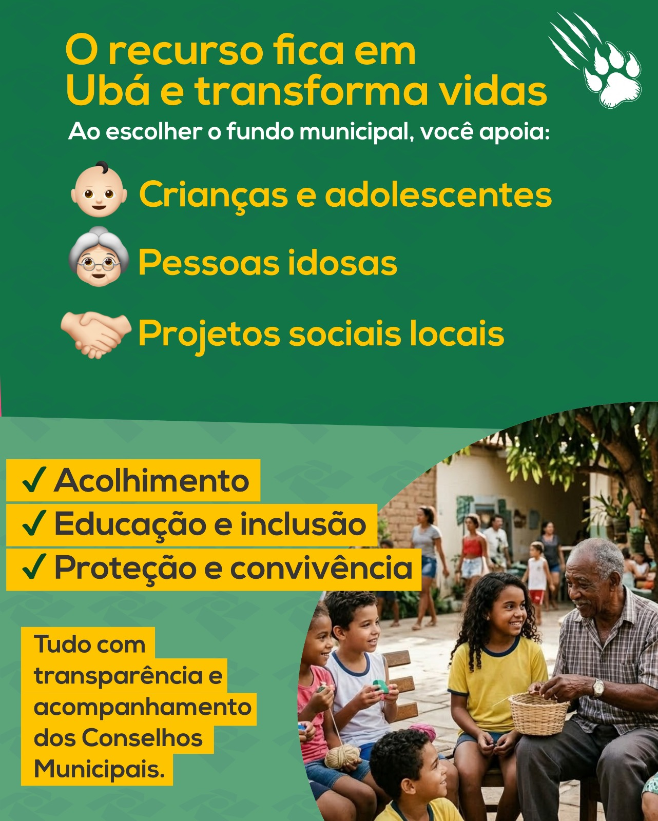 Ao escolher os fundos municipais, o contribuinte garante que o recurso permaneça em Ubá, fortalecendo diretamente o trabalho de entidades e projetos que atendem crianças, adolescentes e pessoas idosas do próprio município.