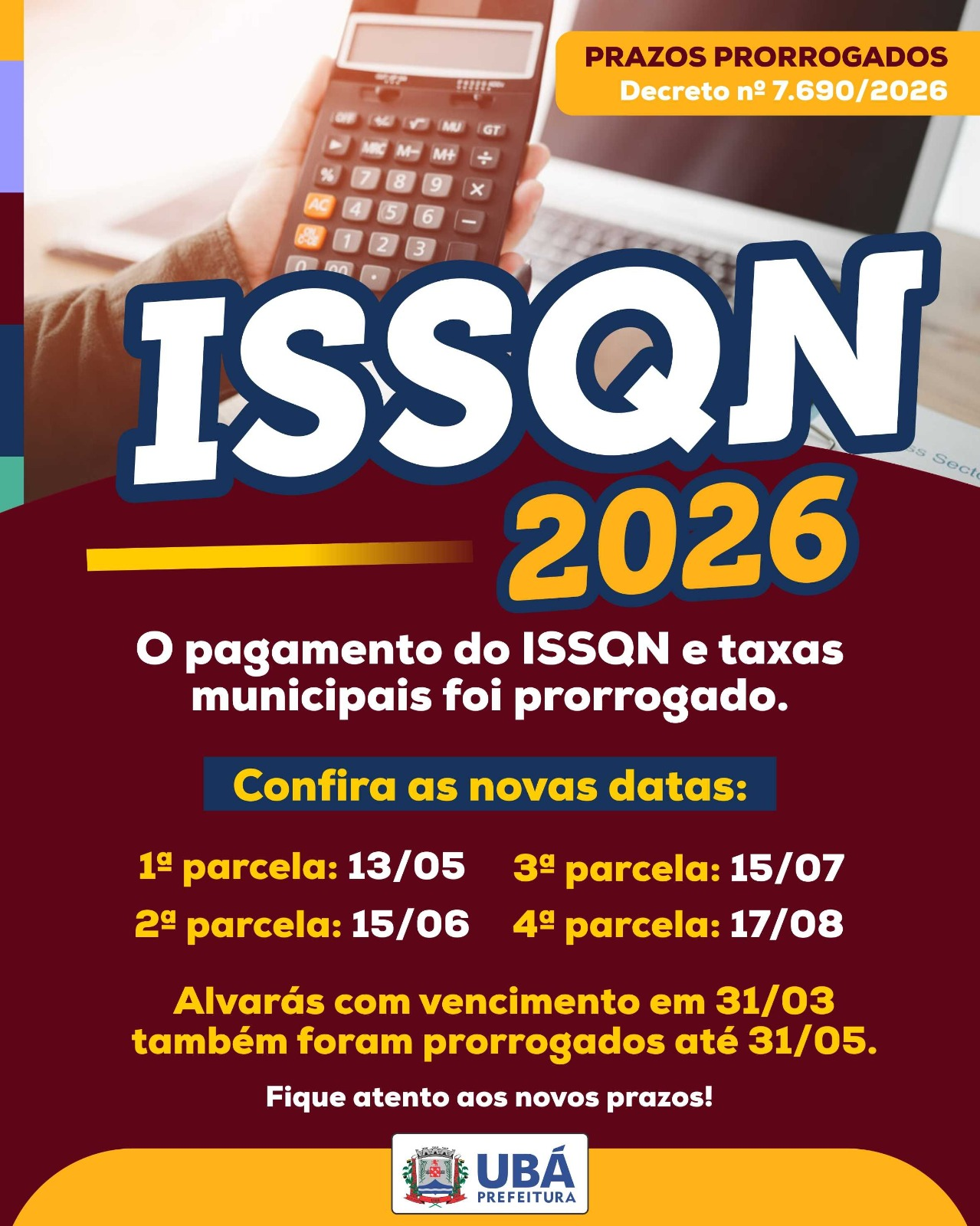 A Prefeitura orienta os contribuintes a ficarem atentos aos novos prazos e aproveitarem o calendário estendido para manter a regularidade fiscal.