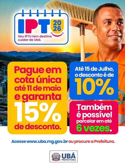 A Prefeitura de Ubá iniciou a campanha do IPTU 2026 com uma proposta de comunicação voltada à transparência, responsabilidade e cuidado com a cidade. Com o tema “Seu IPTU tem destino: cuidar de Ubá”, a campanha busca mostrar à população que o imposto não é apenas uma obrigação anual, mas uma receita importante para manter serviços públicos essenciais e apoiar melhorias em toda a cidade.