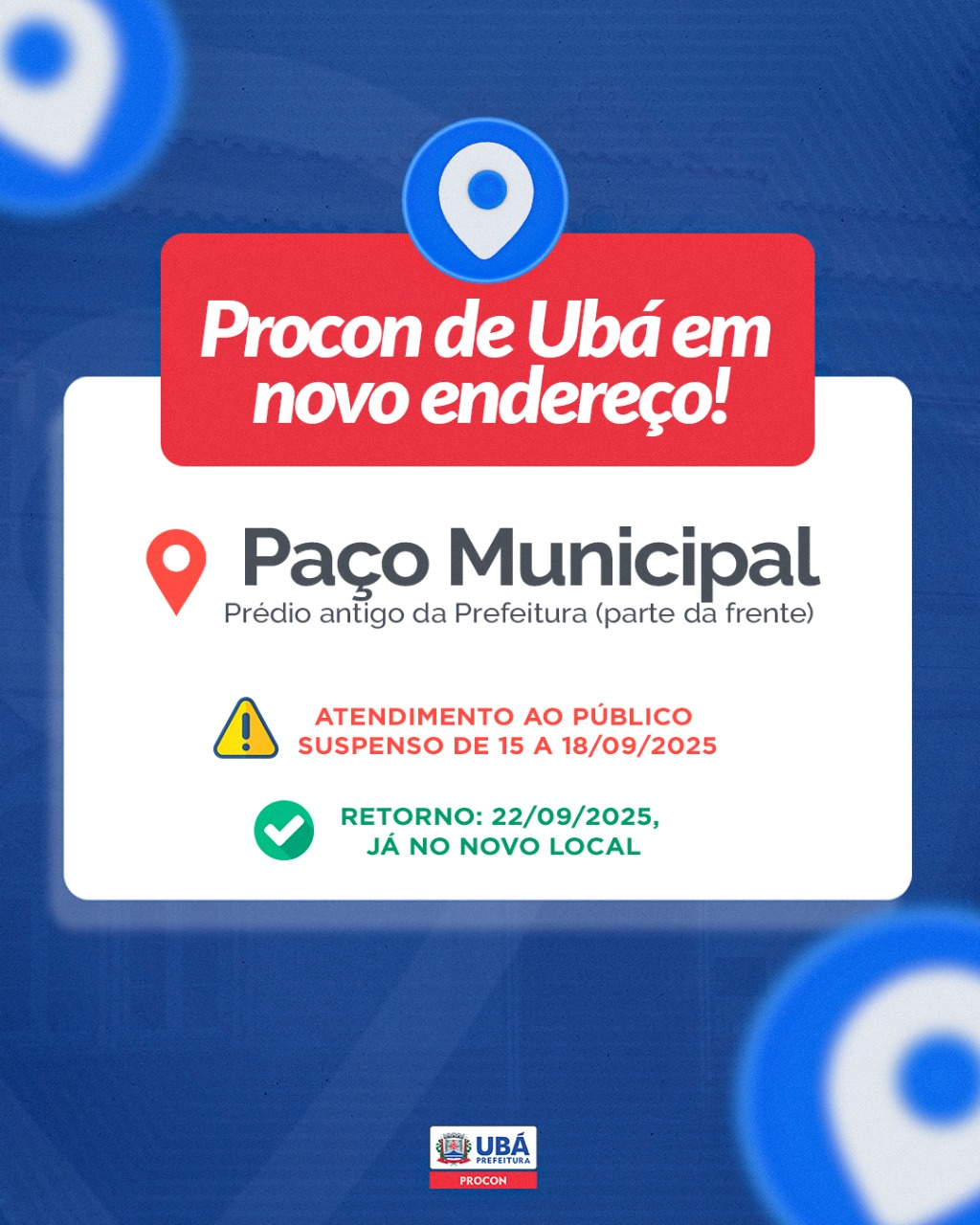 A Prefeitura de Ubá informa que o Procon está de casa nova: a partir do dia 22 de setembro de 2025, o atendimento será realizado no Paço Municipal (prédio que abrigava a Prefeitura, na parte da frente do imóvel), na Praça São Januário.