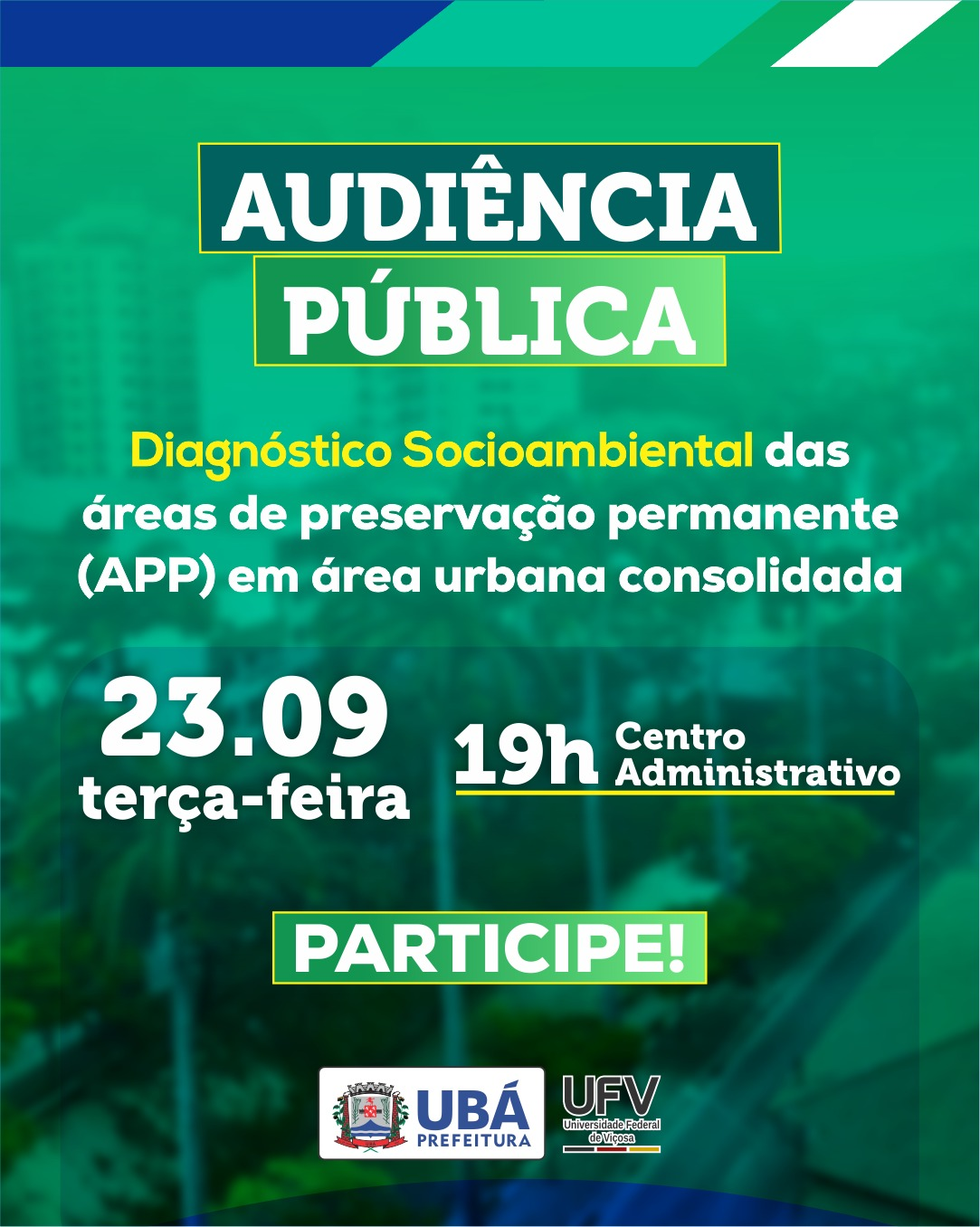 A Prefeitura de Ubá realizará, no dia 23 de setembro (terça-feira), às 19h, no Centro Administrativo, uma Audiência Pública para apresentação e discussão do “Diagnóstico Socioambiental das margens de cursos d’água em áreas urbanas consolidadas”.