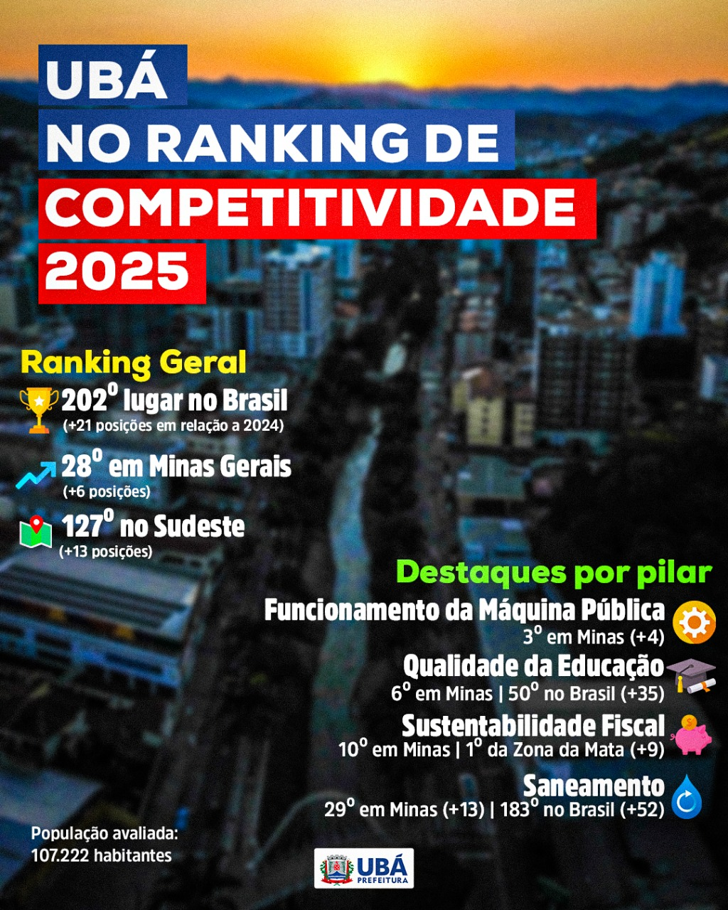 Ubá se destaca entre os municípios mais eficientes de Minas ao conquistar um avanço expressivo no Ranking de Competitividade dos Municípios 2025, elaborado pelo Centro de Liderança Pública (CLP). O município subiu 21 posições em relação a 2024, ocupando agora o 202º lugar no ranking nacional entre 418 cidades avaliadas. No estado, Ubá alcançou a 28ª colocação, seis acima do ano anterior, consolidando-se como referência em gestão pública e desenvolvimento.