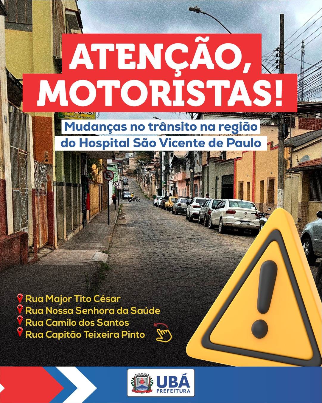 A Prefeitura de Ubá informa que, a partir deste domingo, 28 de setembro, entram em vigor as alterações no trânsito nas vias do entorno do Hospital São Vicente de Paulo. As mudanças têm como objetivo melhorar a fluidez do tráfego e garantir mais segurança a motoristas e pedestres.