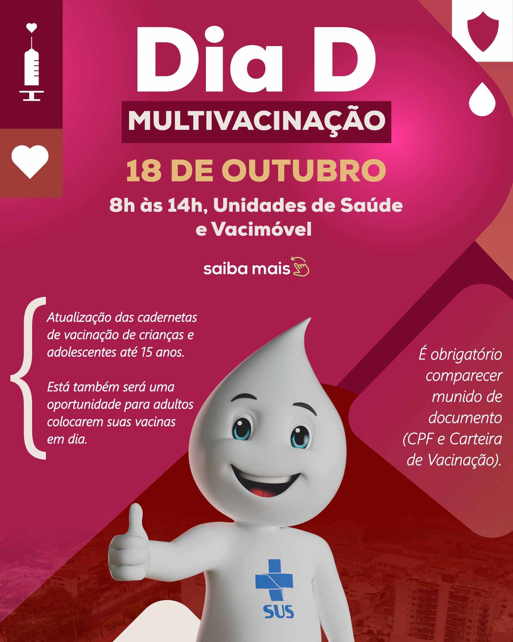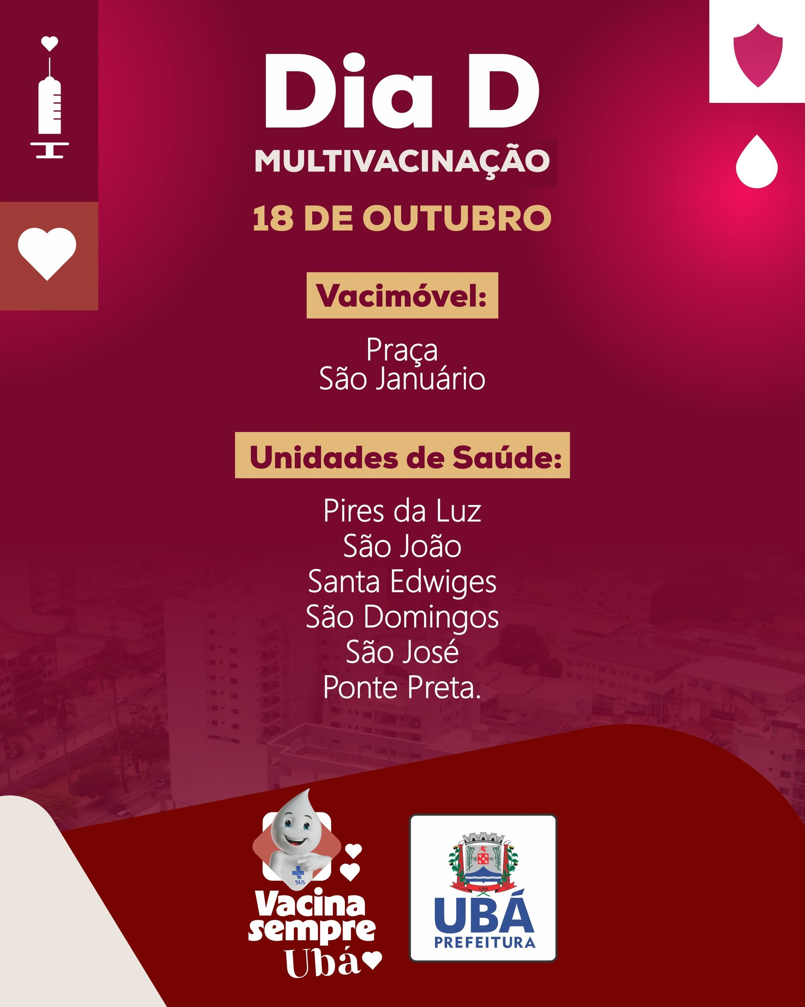 A Prefeitura de Ubá, por meio da Secretaria Municipal de Saúde, promove neste sábado (18/10) o Dia D da campanha de multivacinação, voltado à atualização da caderneta de vacinas de crianças e adolescentes de até 15 anos.