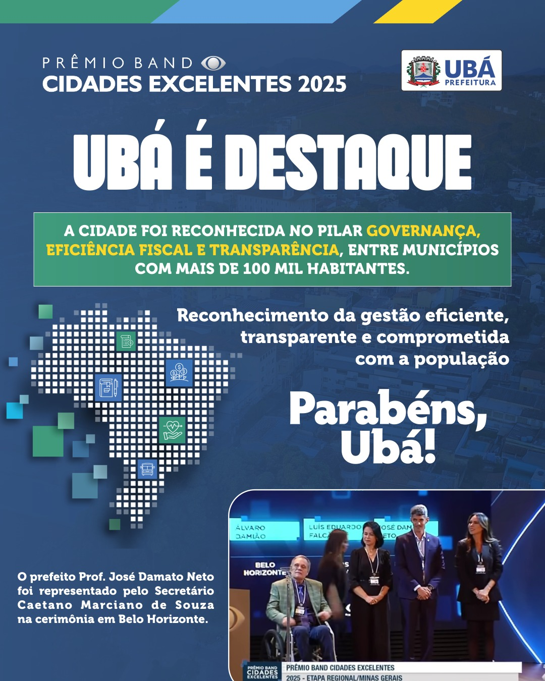 Ubá foi um dos municípios mineiros de destaque na 5ª edição do Prêmio Band Cidades Excelentes. Na etapa estadual de 2025, a cidade foi reconhecida no pilar Governança, Eficiência Fiscal e Transparência, na categoria destinada a municípios com mais de 100 mil habitantes, ao lado de Belo Horizonte e Poços de Caldas.