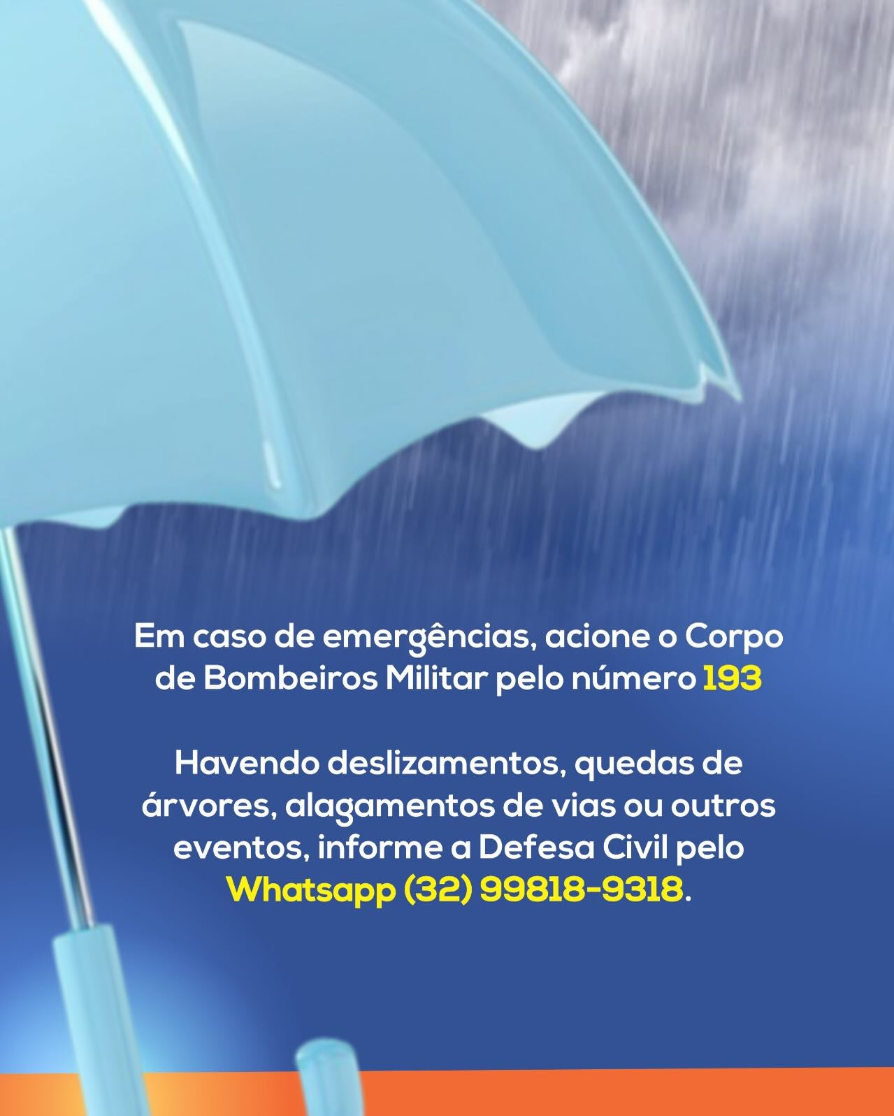 Havendo deslizamentos, quedas de árvores, alagamentos de vias ou outros eventos, informe a Defesa Civil pelo Whatsapp (32) 99818-9318