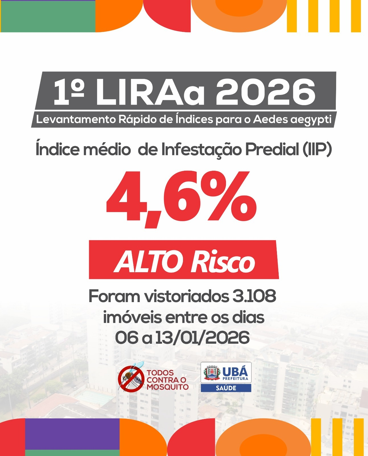 A Secretaria Municipal de Saúde de Ubá, por meio da Divisão de Vigilância em Saúde e do Setor de Zoonoses, divulgou os resultados do primeiro Levantamento de Índice Rápido para o Aedes aegypti (LIRAa) de 2026. O levantamento apontou alto risco de infestação do mosquito transmissor da dengue, zika e chikungunya, com índice de 4,6.